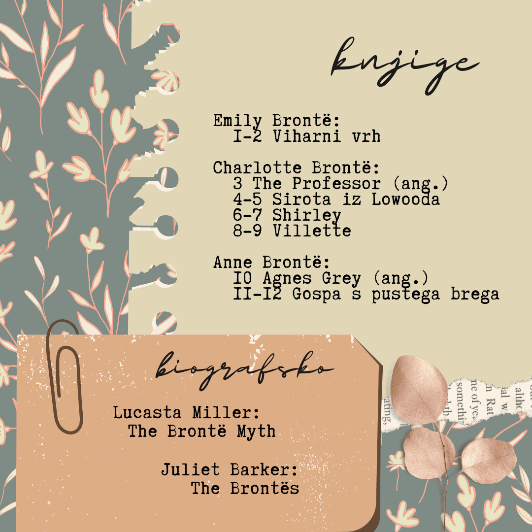 Vsa temeljna dela sester Brontë sem razporedila po mesecih. V večini gre za eno delo na dva meseca, krajša dela imajo svoj mesec. Začela bom pri Emily in njenem edinem romanu Viharni vrh. Najdlje se bom zadržala pri Charlotte Brontë, katere romane bom brala kronološko: od prvega, ki ga je napisala, do zadnjega. Za uvod bo tako služil The Professor, ki mu bo sledil njen najbolj znan roman Sirota iz Lowooda oz. Jane Eyre. Charlottin opus bosta zaokrožila romana Shirley in Villette. Leto pa bom zaključila z Anne Brontë: v jesen me bo pospremil njen kratek roman Agnes Grey, čisto na koncu pa bo na vrsto prišla Gospa s pustega brega.