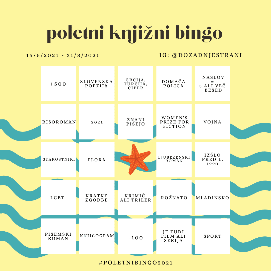 Če si brez idej ali če nisi prepričan_a česa se lotiti za katerega od kvadratkov, me vedno lahko kontaktiraš in ti bom podala nekaj predlogov. Bralni seznami za določene kvadratke bodo dostopni @dozadnjestrani in na Knjižnem kažipotu, povezave do vseh pa bo mogoče najti tudi v tej ‘glavni objavi’.