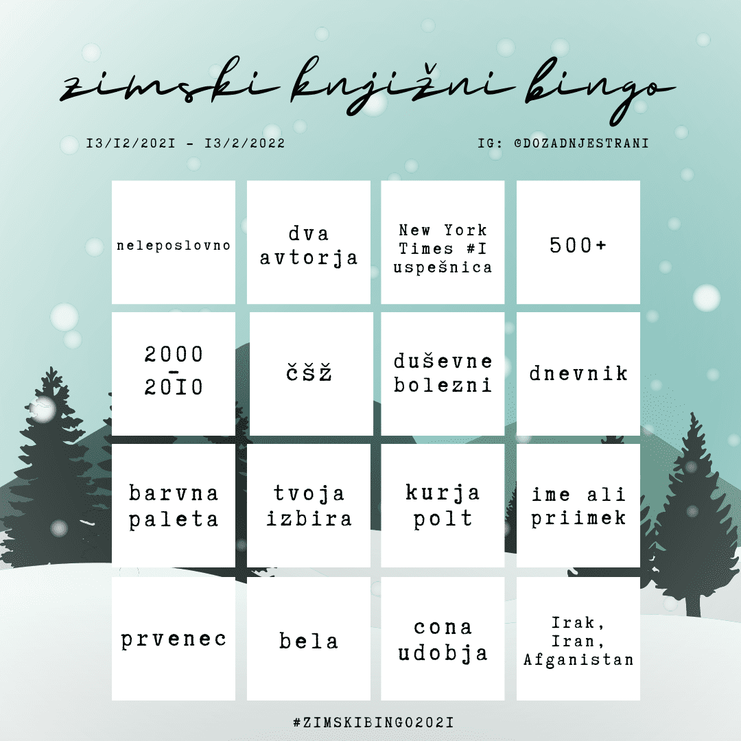 Od 13. decembra 2021 do 13. februarja 2022 bomo znova raziskovali literarni svet, brali knjige in lovili bingo. Kot ste že navajeni, bo večina bingo aktivnosti potekala na mojem Instagram profilu @dozadnjestrani, prav tako pa se bom potrudila malce izboljšati mojo aktivnost na Facebooku (naj me nekdo drži za besedo!). Obenem sem nedavno odprla debatno skupino na knjižnem portalu Goodreads, kamor se lahko včlanite in v skupinskem forumu bingate in ‘mingljate’ z drugimi bralci.